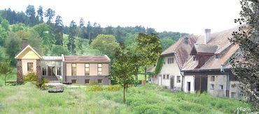 Ablesbarkeit von neuen und alten Gebäuden bei Kongruenz der Gebäudeteile durch Form Höhe und Baumasse. Moderne Interpretation der vorhandenen Bruchsteinbauteile als gliederndes Element der Fassade. Beibehaltung der Ensemblewirkung des Gärtnerhäuschen im Kontext mit dem angrenzenden Gutshofgebäude.