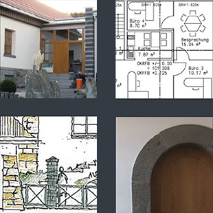 Unterkellerter Büroanbau in Massivbauweise mit sichtbarer Holzbalkendecke. Fugenausbildung des Zwischenbaus mit Zinkblecheindeckung und einer Ausführung der restlichen Dachflächen mit Tonpfannen. Detailausbildungen wie Fensterbänke und Sockelbekleidungen aus farbig passendem Naturstein in Anlehnung an die historische Bauausführungen.